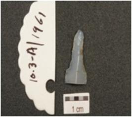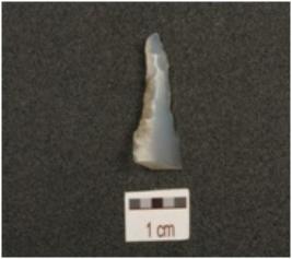 | Description / विवरण | A chalcedony blade, one ridge on surface and use marks on cutting edge. |