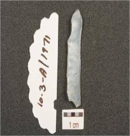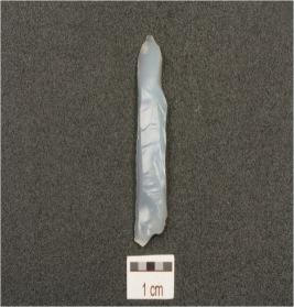 | Description / विवरण | A chalcedony one sided flake, use marks on cutting edge, prepared platform and bulb diffused on ventral side. |