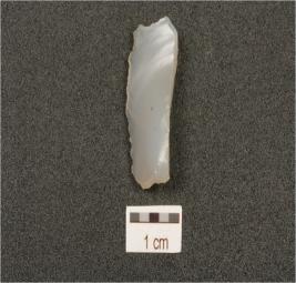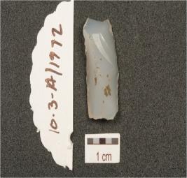 | Description / विवरण | A chalcedony flake, scars on surface, use marks on cutting edge, prepared platform and bulb diffused on ventral side. |