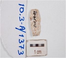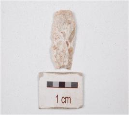 | Description / विवरण | A chert blade, triangular cross-section, distal end broken, prepared platform, prominent bulb on ventral side and use marks along the cutting edges. |