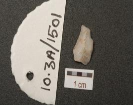 | Description / विवरण | Chert flake with ridge on dorsal and diffused bulb on ventral. |