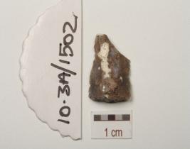 | Description / विवरण | Fragment of chert blade with prominent double-ridge on dorsal and trapezoidal in cross-section. |