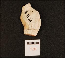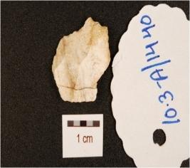 | Description / विवरण | Endstruck chert flake with prepared platform and prominent bulb on ventral side. |