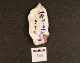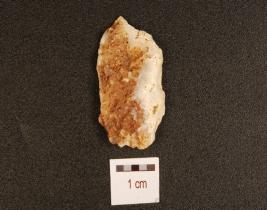 | Description / विवरण | Flake made on chert, prepared platform, prominent bulb, flake scars on the surface, cortex intact. |