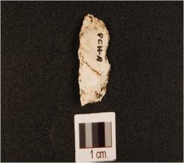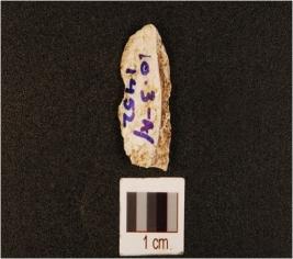 | Description / विवरण | A chert flake, single ridged, flake scars on surface, irregular edges and prepared platform. |