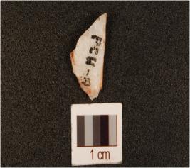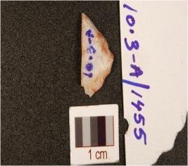 | Description / विवरण | A triangular shaped chalcedony flake, double ridged, irregular edges, prepared platform and three flake scars. |