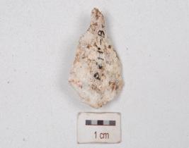 | Description / विवरण | An end struck chert utilized flake, prepared platform, diffused bulb on ventral side, partly broken distal end, ridge on dorsal side and use-wear marks on lateral edges. |