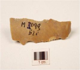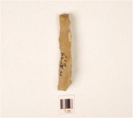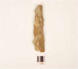 | Description / विवरण | Chert blade with triangular cross section, use-wear marks along the cutting edge, wavy mid ridge, bulb absent and prepared platform. |