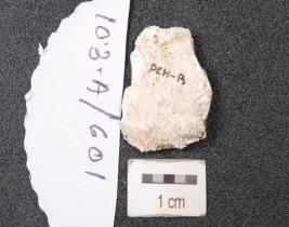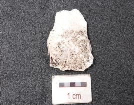 | Description / विवरण | An end struck chert flake, prepared platform and prominent bulb on ventral side. |
