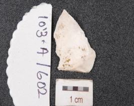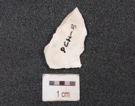 | Description / विवरण | A side struck utilized flake, prepared platform, prominent bulb on ventral side and use-wear marks along sharp edges. |
