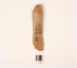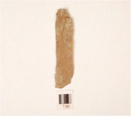 | Description / विवरण | Chert blade with prepared platform, use-wear marks along the cutting edge, prominent bulb on ventral side and prepared platform. |