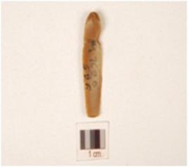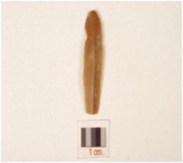 | Description / विवरण | Chert blade with triangular cross section, prepared platform, use wear marks along the cutting edge and prominent bulb on ventral side. |