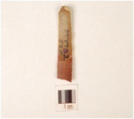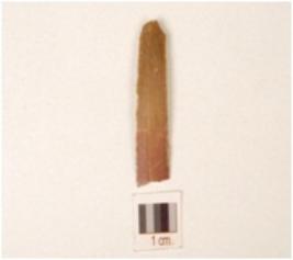 | Description / विवरण | Chert blade with prepared platform, use-wear marks along the cutting edge and trapezoidal cross section. |