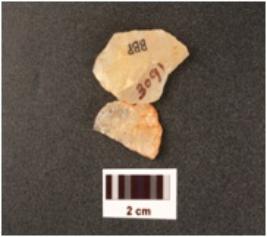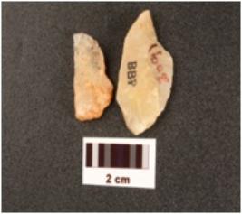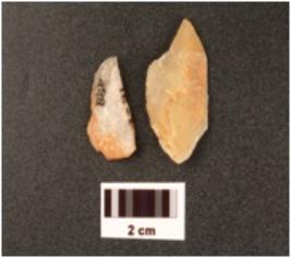 | Description / विवरण | Flakes made on quartz, irregular in shape uneven surface and use wear marks on edges, broken in to two pieces. |