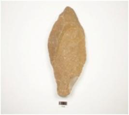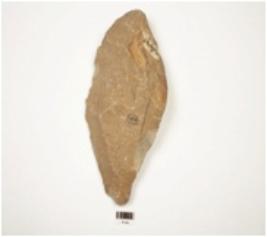 | Description / विवरण | A bifacial handaxe made on quartzite pebble with irregular retouch on tapering sides, slightly chipped off along anterior end and triangular cross section. |
