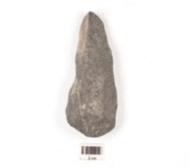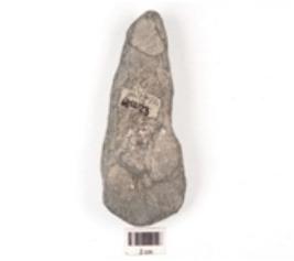 | Description / विवरण | A unfinished celt made on basalt with triangular shaped, broad cutting edge, flake scars, cortex on surface and oval cross section. |