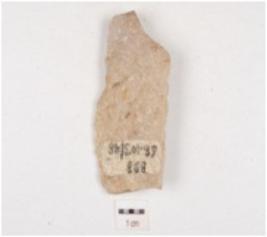 | Description / विवरण | Fragment of a blade, made on quartzite with prominent mid-ridge on dorsal, triangular cross-section, prepared platform, bulb absent and use-wear marks on cutting edge. |