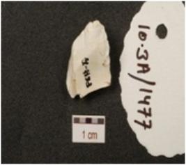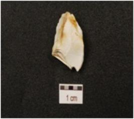 | Description / विवरण | A flake made of chert, blade scars on dorsal broken from both ends and white in colour. |