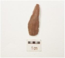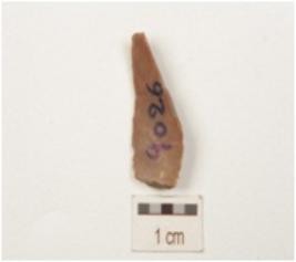 | Description / विवरण | Fragment of a blade, made on chert, previous blade scars on dorsal side, prepared platform, bulb absent on ventral side, triangular in section use-wear marks along the cutting edge and broken along the distal end. |