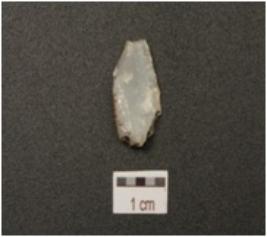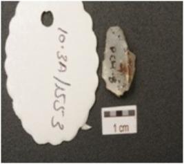 | Description / विवरण | A chalcedony flake with cortex and flake scars on the surface. |