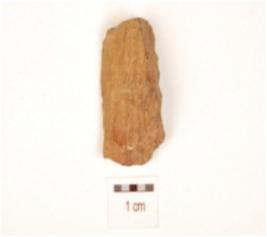 | Description / विवरण | A flake made of chert, has single ridge, two flake scars, diffused bulb on ventral irregular edges and prepared platform. |