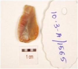 | Description / विवरण | A blade made of chalcedony single ridge with flake scars on dorsal, use marks on edges and diffused bulb on ventral. |