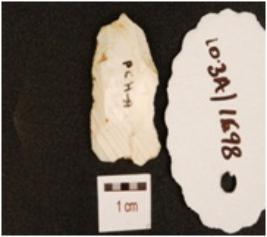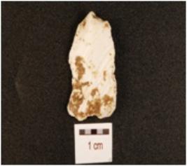 | Description / विवरण | A chert blade with flake scars on dorsal, prepared platform, bulb on ventral and use wear marks on cutting edge. |