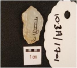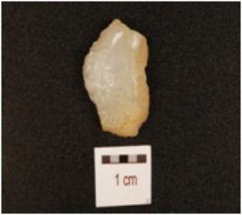 | Description / विवरण | Fragment of a chalcedony blade with flake scars, cortex on dorsal and use-wear marks on edge and prepared platform, bulb on ventral. |