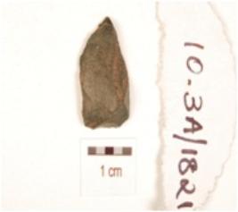 | Description / विवरण | A blade made of chert, single ridge on dorsal and irregular edges. |
