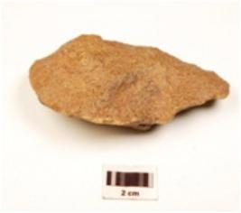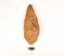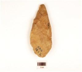 | Description / विवरण | A hand axe made on quartzite stone, pointed end, bi-convex, irregular edges, uneven surface with flaking scars. |
