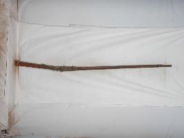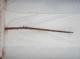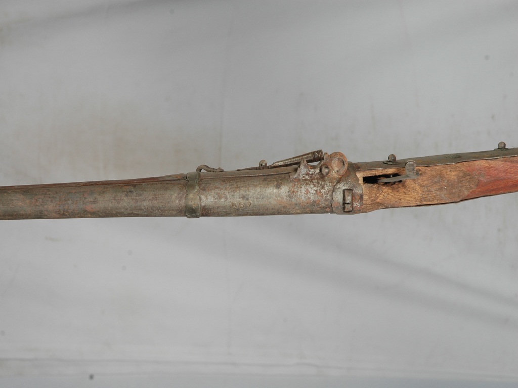 A 18th century muzzle loading match lock gun . Number 557 is engraved on the barrel of the gun.