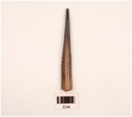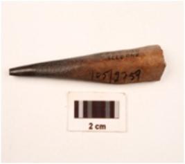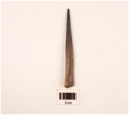 | Description / विवरण | Bone point pointed end broked hollow part of bone on one side of surface smooth and polished surface charred. |