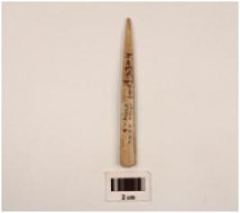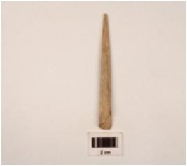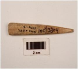 | Description / विवरण | A point made on bone with polished surface slightly broken from printed end, rectangular in section. |