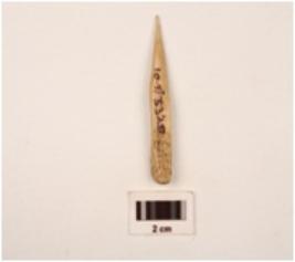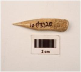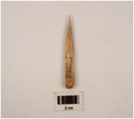 | Description / विवरण | A point made on bone with polished surface one thickend end borked tip. |