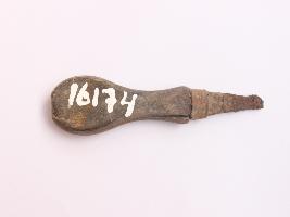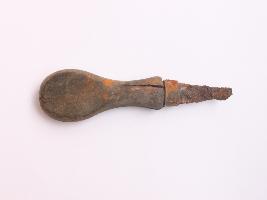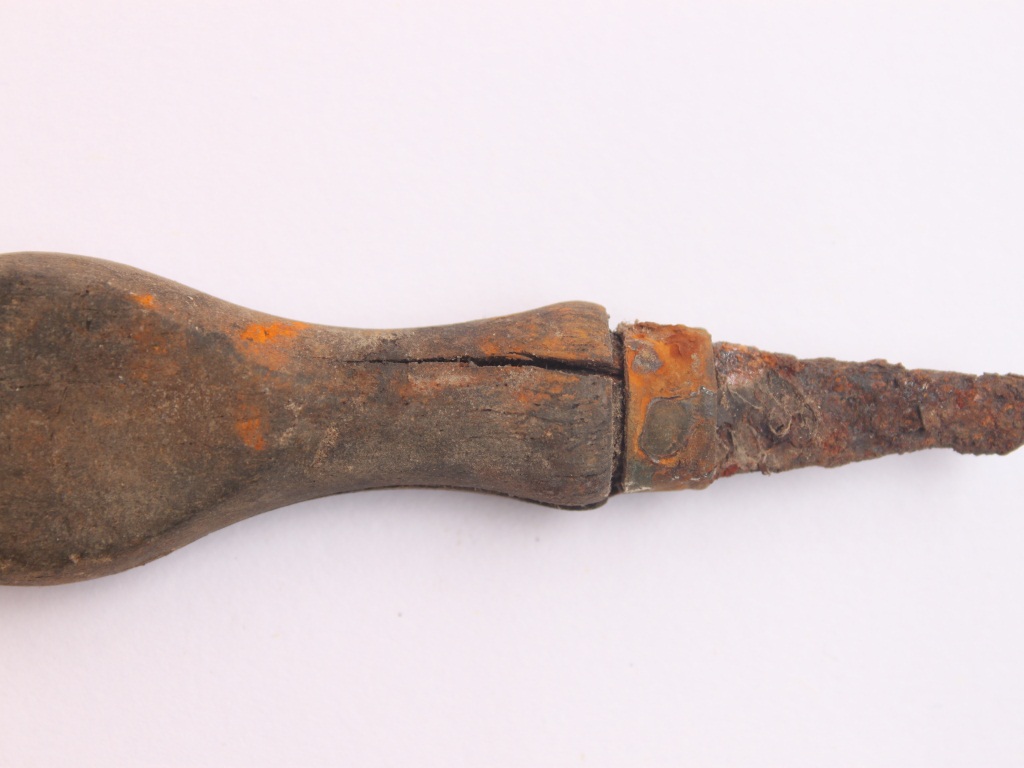 It is a screw driver with plain and rounded grip and the root end has a metal strip. End is pointed and short.
