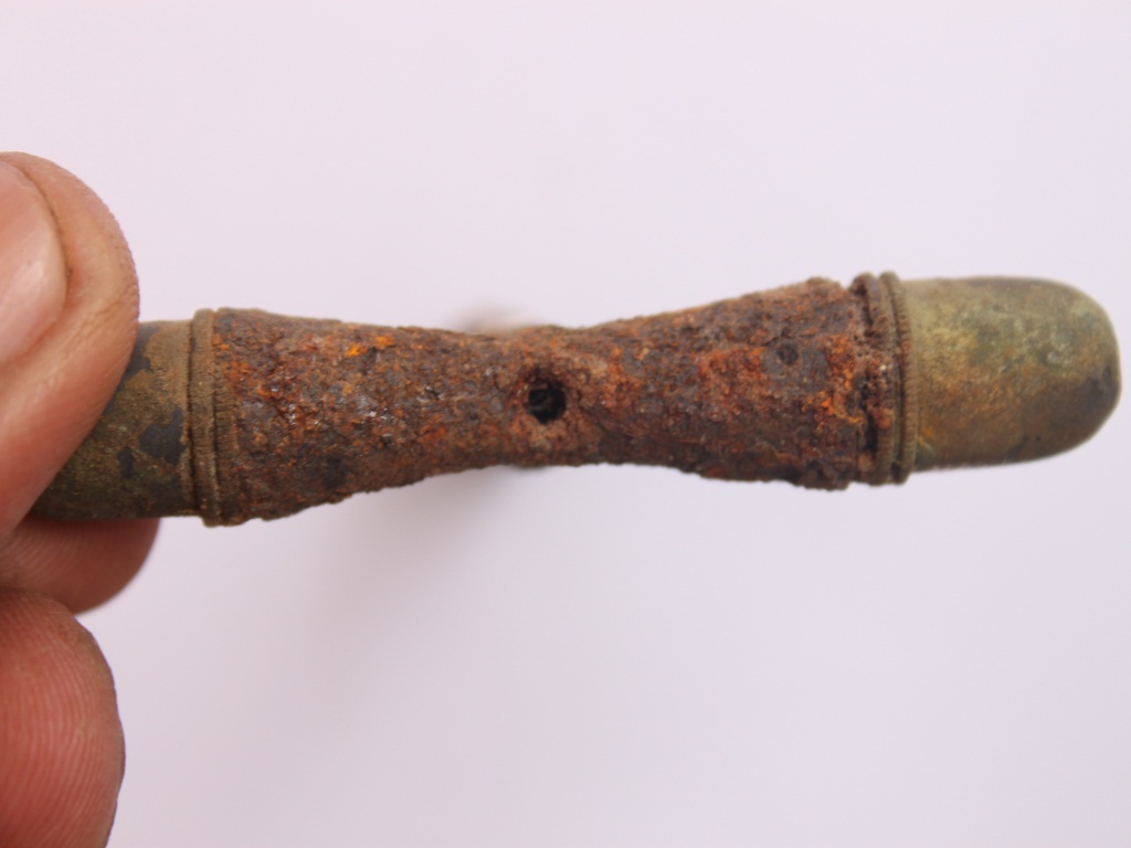 It is a screw driver with plain grip and long bar and the root end has a metal strip. End is shaped with small lines.
