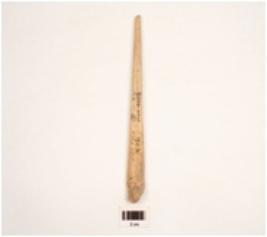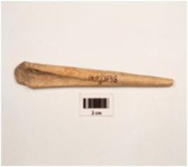 | Description / विवरण | A bone point made with long bone sharp tip is missing one end is tapered dippressed at in side rough but polished surface. |