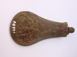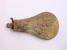 | Description / विवरण | It is a gun powder flask with lever, sprout and spring. The flask has rounded bottom and is ornamented with a picturesque scene with a man followed by a dog. Behind the dog there is a tree and shrub leaves. Man is holding a long unidentified object and he has a sling bag on his shoulder. This scene is placed between a decorative frame. |