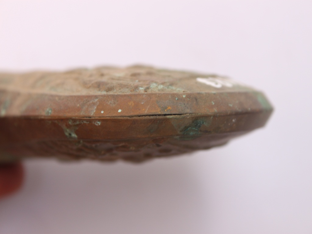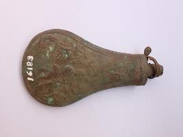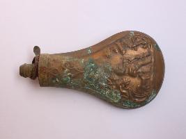 It is a gun powder flask with lever, sprout and spring. The flask has rounded bottom and is ornamented with a picturesque scene with a man followed by a dog. Behind the dog there is a tree and shrub leaves. Man is holding a long unidentified object and he has a sling bag on his shoulder. This scene is placed between a decorative frame. But the work is badly damaged.
