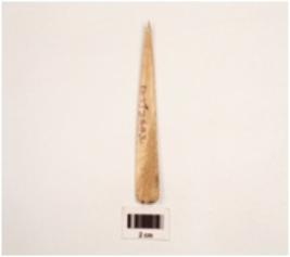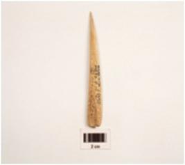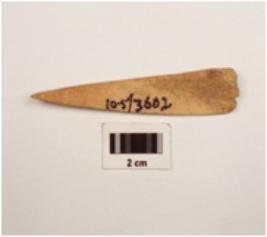 | Description / विवरण | A bone point made on flat bone slightly covred diprssed on inner side sharp tip is intact smooth and polished surface. |