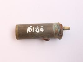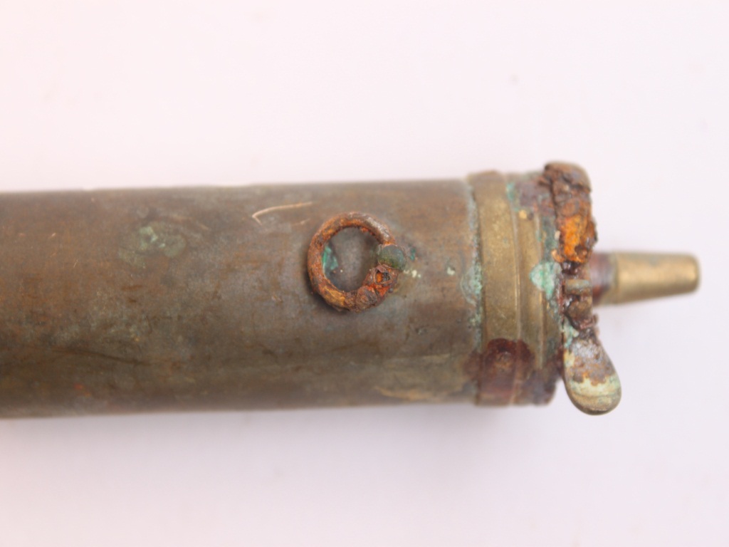 It is a gun powder flask with lever, sprout and spring. The flask has cylindrical bottom without any ornamentation. Two lines are carved on the cap and there is a loop under the cap.