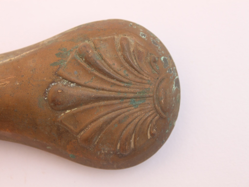 It is a gun powder flask with lever, sprout and spring. The flask has rounded bottom with tiangular petals decorating it. Two lines are carved on the cap.
