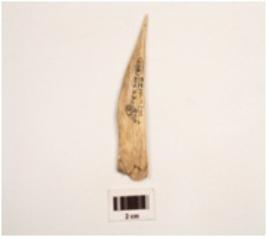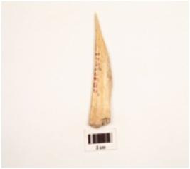 | Description / विवरण | A bone point made on flat and short bone one end is pointed surface is smooth and polished. |