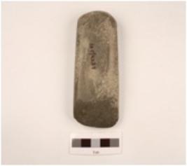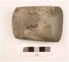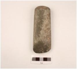 | Description / विवरण | A stone celt with rectangular butt rectangular in shape bevelled edge fully ground or polished partly chipped off polished layer. |