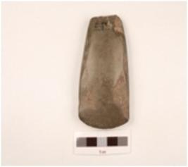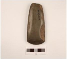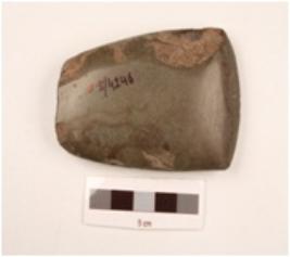 | Description / विवरण | A stone celt butt end broken indeterminate butt shape bevelled edge fully groundor polished partly chepped off surface. |