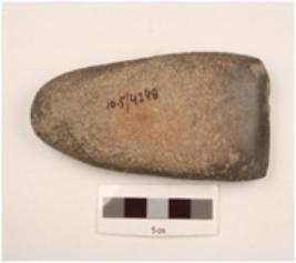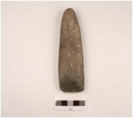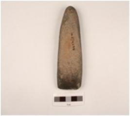 | Description / विवरण | A stone celt with rounded butt bevelled edge fully ground or polished chipped off polished layer. |