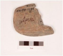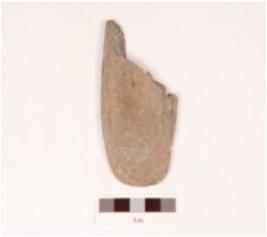 | Description / विवरण | Himalayan soft stone harvester with flat smooth surface convex working edge partally damaged other end. |