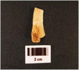 | Description / विवरण | Blade made by quartz with sharp at both parallel sides, proximal end broken, triangular cross section, use wear mark on the cutting edges. Cortex on the surface. |