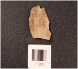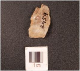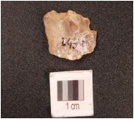 | Description / विवरण | Fragment of a end-struck flake with cortex on dorsal side, broken along proximal end, use-wear marks along one end. |