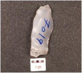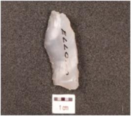 | Description / विवरण | A flake made of chalcedony, flake scars on the dorsal side, prominent bulb on the ventral side, prepared platform on the proximal end and wavy cutting edges. |